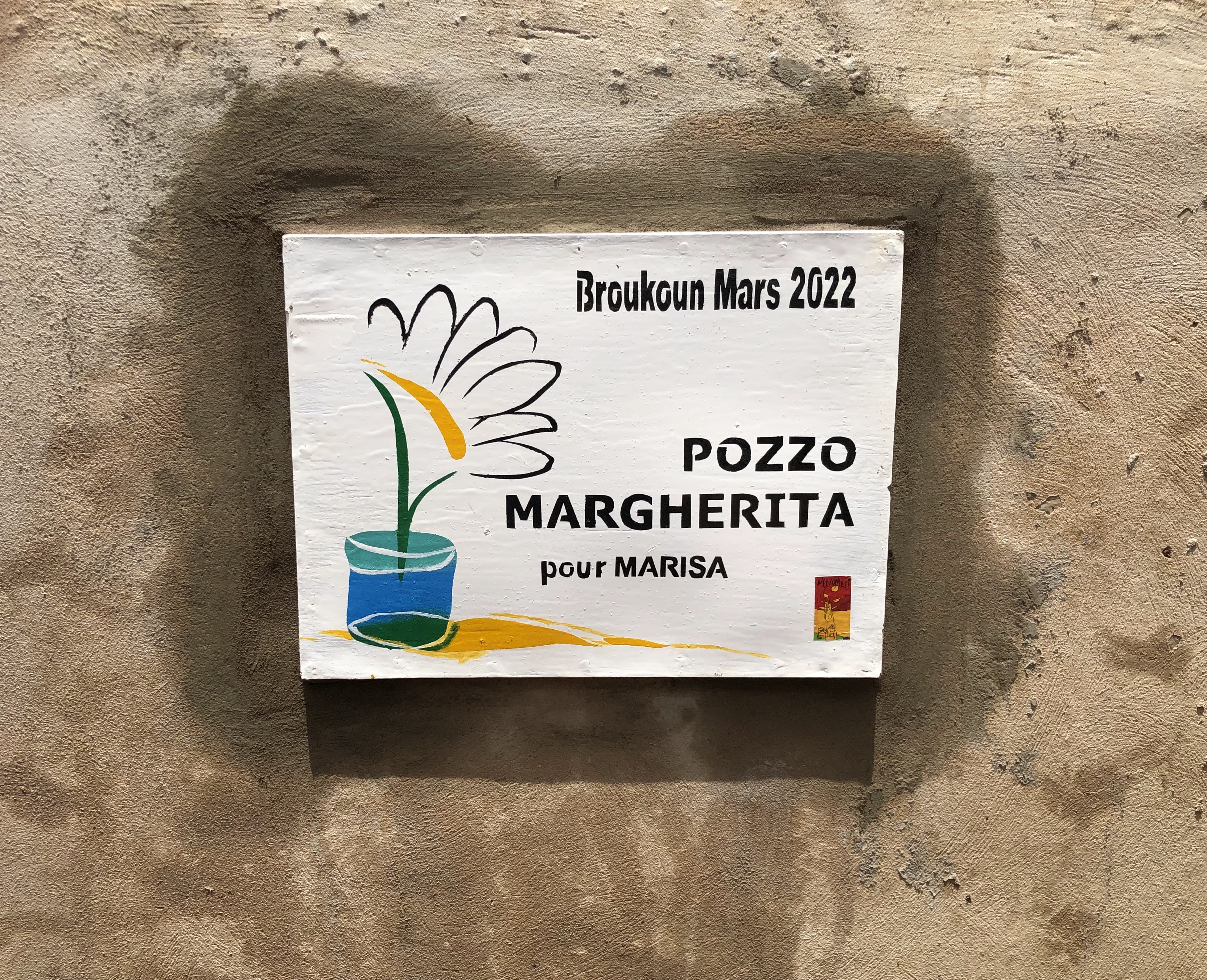La targa 'pozzo Margherita ' realizzata da un artigiano a Kati, svetta stabile e fiera sul lato corto del pozzo, quello orientato a nord, dove c'è la stella polare .